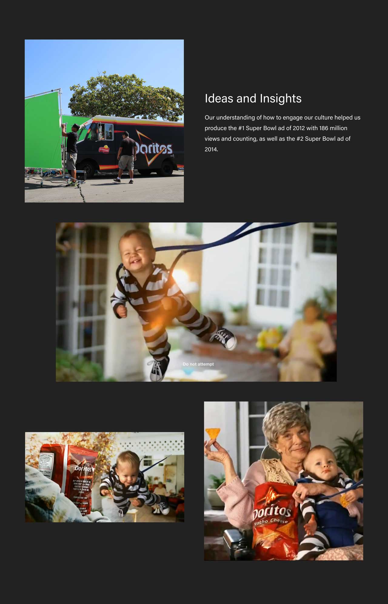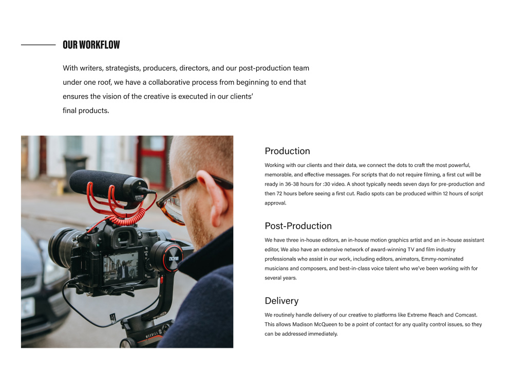 As with most of our websites, we built the site on WordPress, which gives the client flexibility to make future updates on their own. Individual project pages were designed with a collage-style layout, allowing each to be unique depending on the content MadMac decided to feature. They have the ability to feature multiple hero videos, behind-the-scenes images, GIFs, or video of varying sizes and alignment, as well as text blocks so they can explain the ideas and insights that went into creating the work.